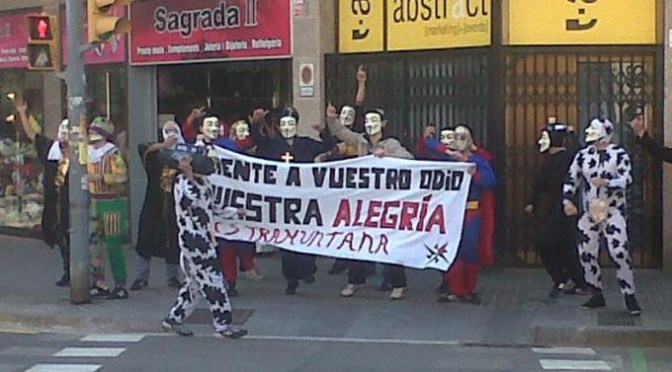 “Hola…despues de que se acabase la cacerolada vecinos del barrio informan que los enmascarados, ya con la cara al descubierto y en grupo, han salido del local y con actitudes chulescas han subido por la calle Independencia y a la altura de Freser han hecho un amago de perseguir a alguien, para proseguir a continuacion hasta Corcega desde donde han continuado direccion 2 de Maig. Se podria interpretar que despues de hacer el payaso con sus disfraces han tenido necesidad de demostrar su “HOMBRIA EN GRUPO” y al mismo tiempo intentar asustar al vecindario para que no participe en proximas movilizaciones.