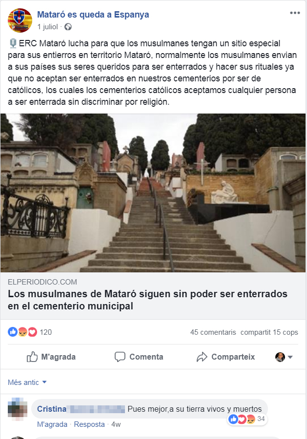 Mataro_esp_islamofob 1 Agost 2018 629 × 901 Democracia Nacional… Fascistas de manual PxC utiliza el grupo de Facebook de “Mataró es Queda a Espanya” para promover el odio hacia el vecindario musulmán.