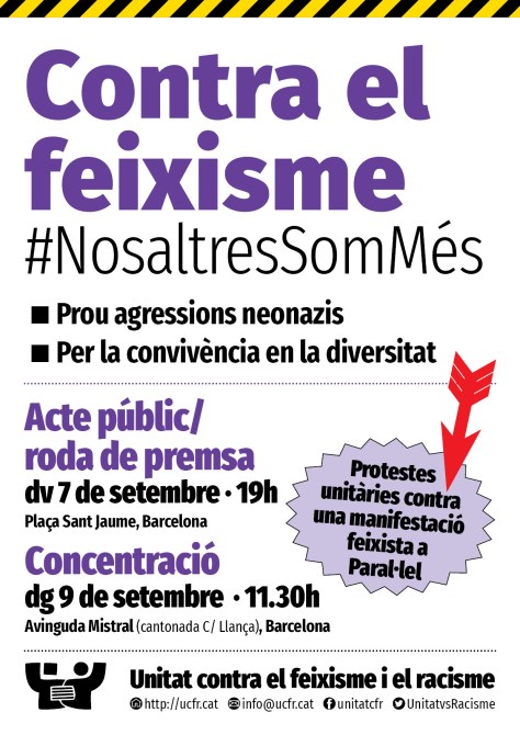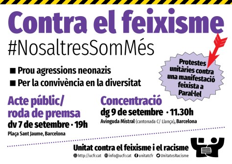 - El diumenge, 9 de setembre, a les 11.30h, convoquem una concentració ciutadana a Avinguda Mistral, prop de Paral·lel, per expressar el rebuig ciutadà davant la manifestació feixista; posteriorment marxarem de la zona col·lectivament, en direcció contrària.