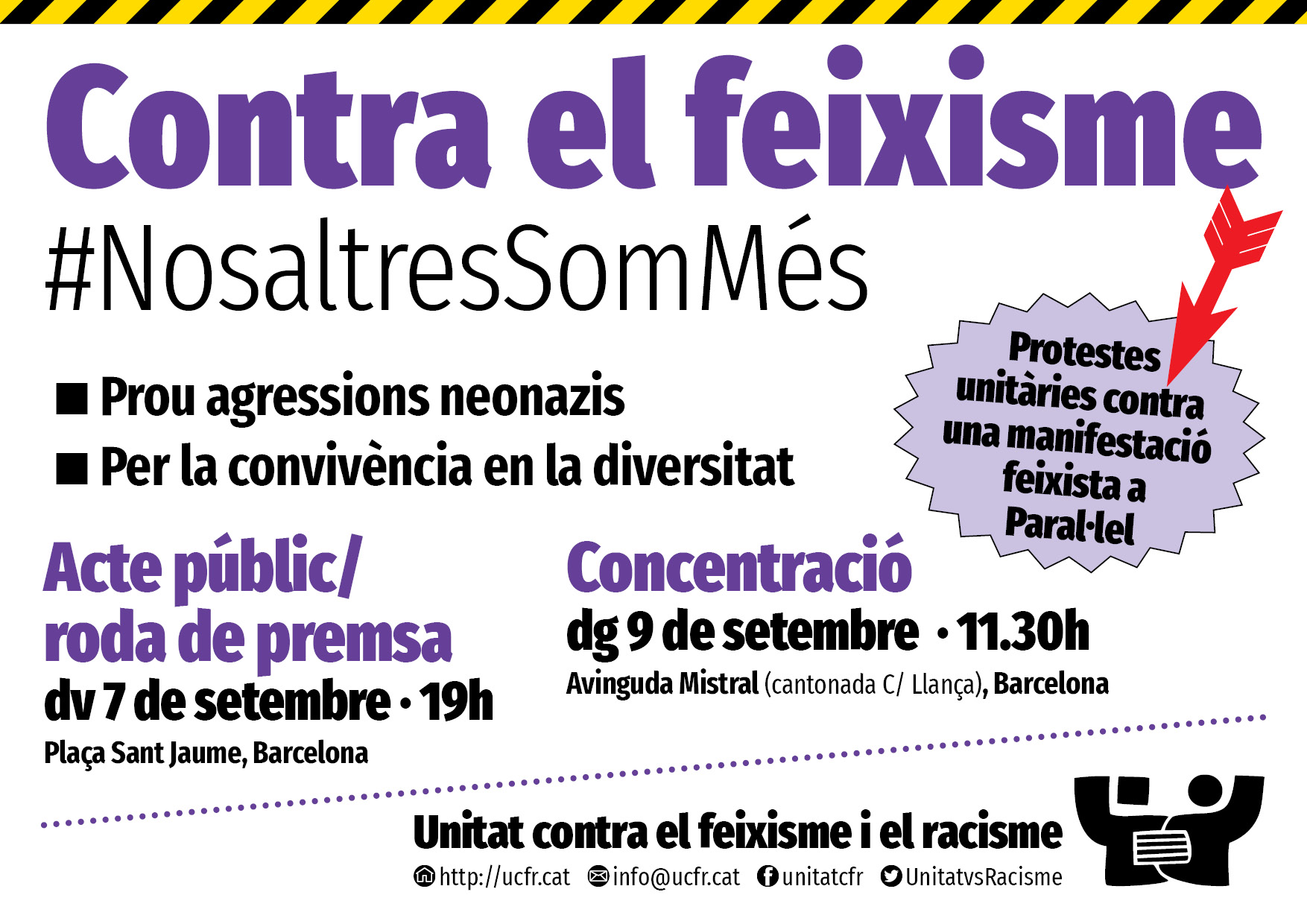 - Convoquem sota el lema: “Contra el feixisme, #NosaltresSomMés”, així com els missatges “Prou agressions neonazis”; “Per la convivència en la diversitat”.