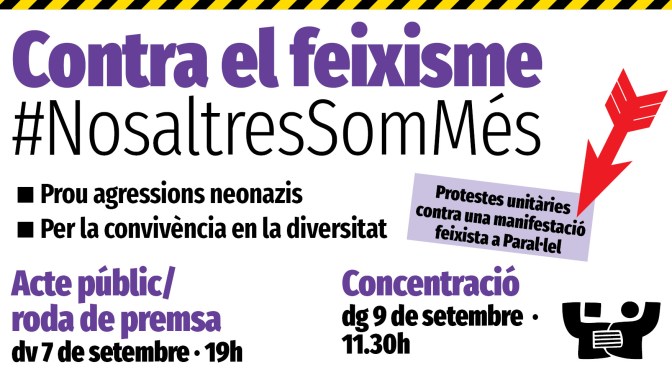 El diumenge, 9 de setembre es convoca una manifestació d’extrema dreta a l’Avinguda del Paral·lel de Barcelona. Volen protestar contra el govern de Pedro Sánchez amb la crida “No queremos ni separatistas ni terroristas en el gobierno”. La impulsa un home de negocis i ex guàrdia civil resident a Suïssa, Jose Manuel Opazo, amb el suport de grups i individus feixistes i neonazis, com “Democràcia Nacional”. Entre els primers personatges interessats a impulsar la convocatòria figuren persones implicades en recents agressions feixistes a Bages; un d’aquests amics d’Opazo, Raúl Macià, acaba d’entrar a la presó per agressions ultres així com per temes de drogues i robatori violent.Durant l’estiu, diversos mitjans han donat publicitat a la convocatòria i és possible que aconsegueixi cert suport; ja afirmen que vindran autocars de diferents indrets de l’Estat espanyol. Intentaran encobrir la naturalesa real de la convocatòria —per exemple, no permetran símbols de partits— però qui pensa participar-hi ha de tenir clar què representa. No es tracta d’una manifestació democràtica, sinó d’una acció promoguda per l’extrema dreta. Trobem escandalós que es permeti un acte com aquest, que només promou l’odi.