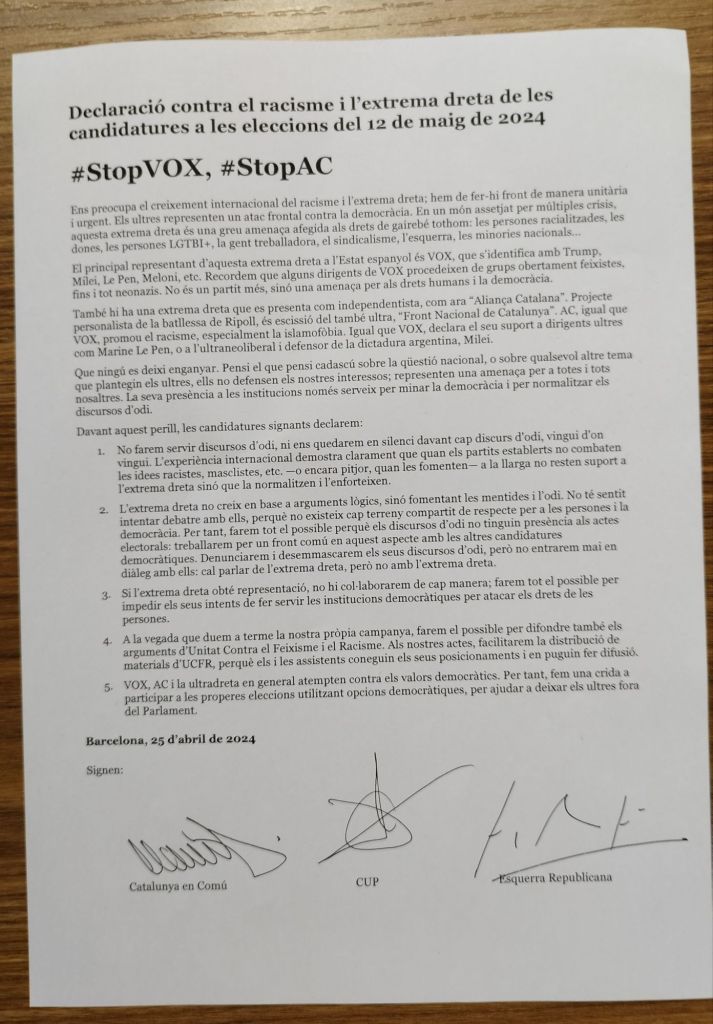 Declaració contra el racisme i l’extrema dreta de les candidatures, adherides a UCFR, a les eleccions del 12 de maig de 2024